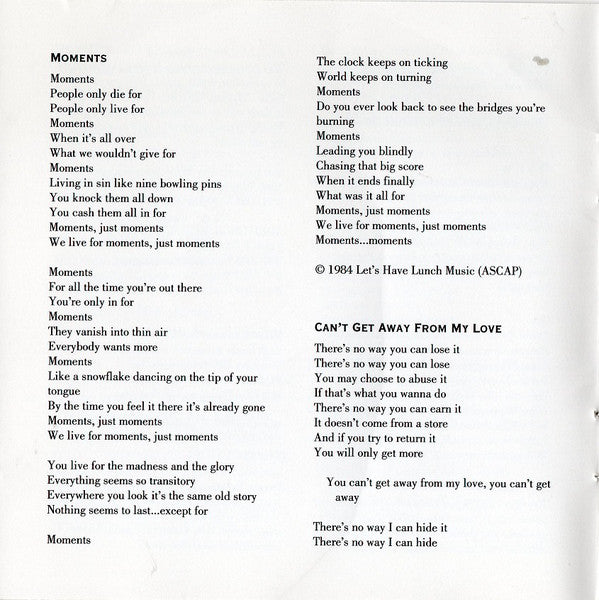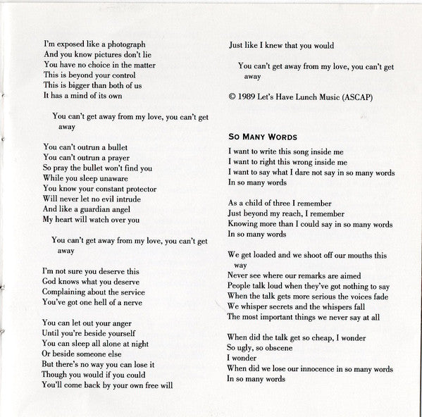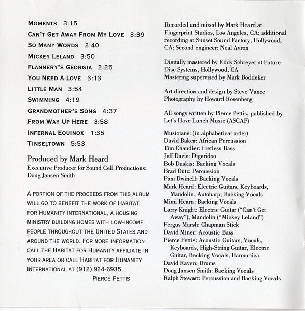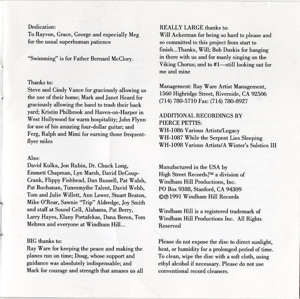 Issued with a 12-page booklet. Printed on backcover: Executive Producer for Sound Cell Productions Manufactured in the USA by High Street Records,™ a division of Windham Hill Productions Inc. P.O. Box 9388, Stanford CA 94309 © ℗ 1991 Windham Hill Records Printed on booklet: Executive Producer for Sound Cell Productions A portion of the proceeds from this album will go to benefit the work of habitat for humanity international, a housing ministry building homes with low-income people throughout the United States ans around the world. For more information call the habitat for humanity affliate in your area or call habitat for humanity international at (912) 924-6935. Pierce Pettis Recorded and mixed [... at Fingerprint Studios, Los Angeles, CA; additional recording at Sunset Sound Factory, Hollywood, CA. Digitally mastered [... at Future Disc System, Hollywood, CA. All songs published by Let's Have Lunch Music (ASCAP) Dedication: To Rayvon, Grace, George and especially Meg for the usual superhuman patience. "Swimming" is for Father Bernard McClory. Thanks to: Steve and Cindy Vance for graciously allowing us the use of their home; Mark and Janet Heard for graciously allowing the band to trash their back yard; Kristin Philbrook and Haven-on-Harper in West Hollywood for warm hospitality; John Flynn for use of his amazing four-dollar guitar, and Ferg, Ralph, Mimi for earning those frequent-flyer miles. Also: David Kulka, John Rubin, Dr, Chuck Long, Emmett Chapman, Lyn Marsh, David DeCoup-Crank, Flippy Fishhead, Dan Russel, Pat Walsh, Pat Buchanan, Tunesmythe Talent, David Webb, Tom and Julie Willett, Ann Lower, Stuart Beaton, Mike O'Rear, Sawnie "Trip" Aldredge, Joy Smith and staff at Sound Cell, Alabama, Pat Berry, Larry Hayes, Elany Portafekas, Dana Beren, Tom Mehren and everyone at Windham Hill... Big thanks to: Ray Ware for keeping the peace and making the planes run on time; Doug, whose support and guidance was absolutely indispensable; and Mark fou courage and strength that amazes us all. Really large thanks to: Will Ackerman for being so hard to please and so committed to this project from start to finish... Thanks, Will; Bob Duskis for hanging in there with us and for manly singing on the Viking Chorus, and to #1-still looking out for me and mine. Managemant [..., 1560 Highridge Street, Riverside, CA 92506 (714) 780-5710 Fax: (714) 780-8927 Additional recordings by Pierce Pettis: WH-1086 Various Artists/Legacy WH-1087 While The Serpent Lies Sleeping WH-1098 Various Artists/A Winter's Solstice III Manufactured in the USA by High Street Records,™ a division of Windham Hill Productions Inc. P.O. Box 9388, Stanford CA 94309 © ℗ 1991 Windham Hill Records Windham Hill is a registered trademark od Windham Hill Productions Inc. Track 1: © 1984 Let's Have Lunch Music (ASCAP) Track 2: © 1989 Let's Have Lunch Music (ASCAP) Track 3: © 1989 Let's Have Lunch Music (ASCAP) Track 4: © 1990 Let's Have Lunch Music (ASCAP) Track 6: © 1984 Let's Have Lunch Music (ASCAP) Track 7: © 1990 Let's Have Lunch Music (ASCAP) Track 8: © 1989 Let's Have Lunch Music (ASCAP) Track 9: © 1984 Let's Have Lunch Music (ASCAP) Track 10: © 1989 Let's Have Lunch Music (ASCAP) Track 12: © 1989 Let's Have Lunch Music (ASCAP) Printed on CD: Executive Producer for Sound Cell Productions Manufactured in the USA by High Street Records,™ a division of Windham Hill Productions Inc. © ℗ 1991 Windham Hill Records