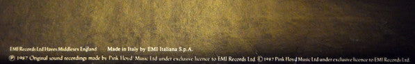 ℗ 1987 Original sound recording made by Pink Floyd Music Ltd under exclusive licence to EMI Records Ltd. © 1987 Pink Floyd Music Ltd under exclusive licence to EMI Records Ltd. Made in Italy by EMI Italiana S.p.A. Grafica Pozzoli S.p.A. Inzago Unreadable texts into the cover. This was an error of the graphics on the first issue.