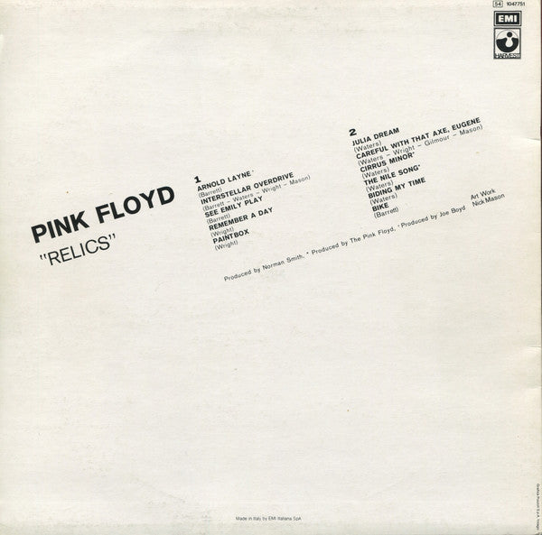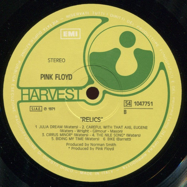 Repressing "Talent" series. Fourth Italian issue (probably 1989). Back cover: In the upper right corner is the EMI / Harvest logo and the catalog number. The song listing is printed in the center. No barcode. Yellow-green Harvest labels. Text around the top edge of the label starts at 11 o'clock and reads: "Riservati tutti i diritti del produttore fonografico e del proprietario dell opera riprodotta". Text around the bottom edge of the label starts at 11 o'clock and reads: "Vietata duplicazione pubblica esecuzione radiodiffusione di questo disco - Made In Italy".