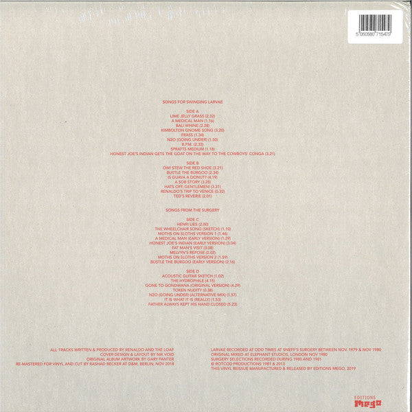 This is the version without the limited bonus 7". The version with bonus 7" has its own entry: [r13735053 Notes from release: Larvae recorded at odd times at Sneff's Surgery between Nov 1979 & Nov 1980 Original mixed at Elephant Studios, London Nov. 1980. Surgery selections recorded during 1980 and 1981 © Rotcod Productions 1981 & 2013 This vinyl reissue manufactured & released by Editions Mego, 2019