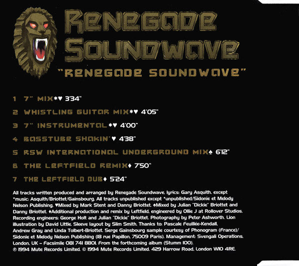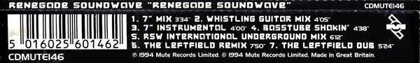 Some copies came with a hype sticker stating "FEATURING LEFTFIELD MIXES". Some copies were used as promos, with stickers on rear of case. Promo text: "Hailed in the late eighties for their inventive fusion of club sound and metropolitan character, Renegade Soundwave are back with this new single which includes mixes by Leftfield."
