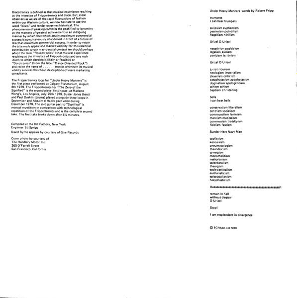(P) 1980 EG Records Ltd. (C) 1980 EG Music Ltd. First published 1980 in U.K. Made in Italy. Distribuzione PolyGram Dischi S.p.A.