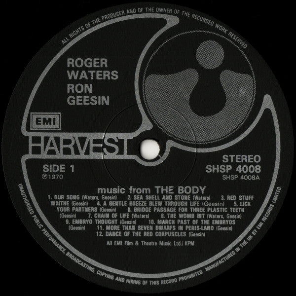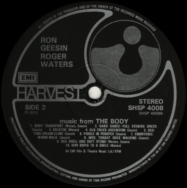 Black Harvest label, no barcode. Back cover: File under POPULAR : Miscellaneous The Body An ANGLO-E.M.I. Presentation Produced by Tony Garnett Directed by Roy Battersby A Kestrel Film Released by M.G.M.-E.M.I. Distributors ℗ 1970 Made and printed in Great Britain 7011 TPS Printed and made by Garrod & Lofthouse Ltd. Patent No. 943 895 SHSP 4008. Disc labels: ℗ 1970 All EMI Film & Theatre Music Ltd./ KPM Manufactured in the UK by EMI Records Limited.