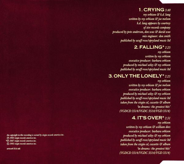 All tracks published by Acuff-Rose/Opryland Music Ltd. Tracks 3, 4 taken from the Virgin CD, Cassette, & Album 'In Dreams: The Greatest Hits' (VGDCD 3514/VGDC 3514/VGD 3514) Track 1 ℗ 1992 Virgin Records America Inc. Tracks 2, 3, 4 ℗ 1987 Virgin Records America Inc. © 1992 Virgin Records America Inc. Manufactured in UK & distributed by Virgin Records Ltd.