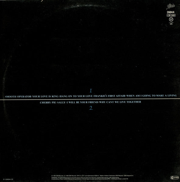 Comes in a gatefold cover with different hype stickers on front. All tracks MCPS (= Rights Society); except B4 published by Southern Music Pub. Co. Ltd. "Thanks also to Our manager ● Lee Barrett Pete ● Anna ● Vicky ● Keith ● Simon ● at the power plant Sarah Bee ● Zwei" Labels: ℗ 1984 CBS Records Made in Holland Sleeve: Recorded - Power Plant ℗ 1984 CBS Records/© 1984 CBS Records/Made in Holland/Distribution CBS Records/CBS Disques S.A. Post 1st-issue presses have two types of 2-color stickers on front cover promoting 4 tracks (A1, A3, A2 and A5 - see 8th image) respectively 3 tracks (A1, A2 and A5 - see 9th image). Cat# EPC 26044 on spine and labels, cat# 26044 on back cover and cover sticker. All runouts are stamped, except ① (circled '1') that is etched. Exception: For variant 8 the A-side runout is fully etched. Duration of tracks is written different on labels and inside gatefold; actual duration on record is as per labels and listed here.