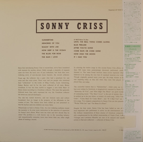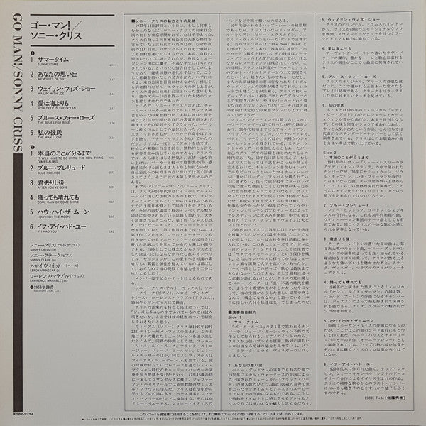 Go Man! It's "Sonny Criss" And Modern Jazz Recorded 28 November, 1956. Original Released 1956 as Imperial LP-9024 / LP 9024 On spine: Liberty (Imperial) K18P 9254 Mono (P) 1983 A Robin Recording Printed in Japan by NPc 1983 Issued with 2-Sided Insert Mostly in Japanese with Some English
