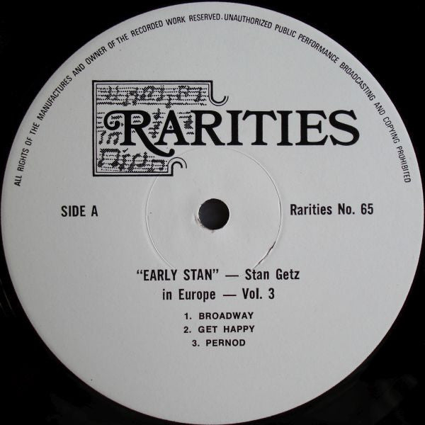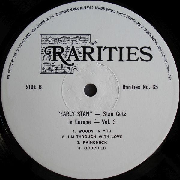 Track A1 to A3 recorded Fredrikstad, Norway on Febr. 20,1959 Track B1 to B4 recorded Stuttgart,Germany on April 28,1959 "First time ever on record" on front cover. Title above according to cover. Labels have the title: "Early Stan -- Stan Getz in Europe -- Vol. 3" Title B1 on cover is misstated as "Woody'in You', and on label B as "Woody In You" Tracks A1-3 are recorded at an unknown venue in the Norwegian town of Fredrikstad, misprinted as Frederiksstad on the cover. Tracks B1-4 are from the Jazz at the Philharmonic concert in Stuttgart on their European 1959 tour. This was a concert evening with Ella Fitzgerald, Oscar Peterson Trio and Roy Eldridge. The venue is probably the fairly new Liederhalle in Stuttgart.
