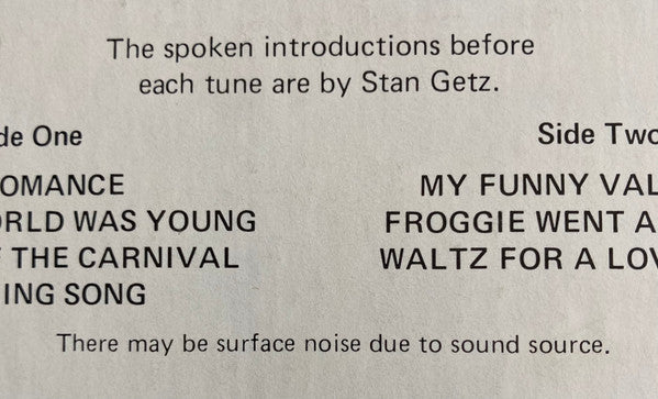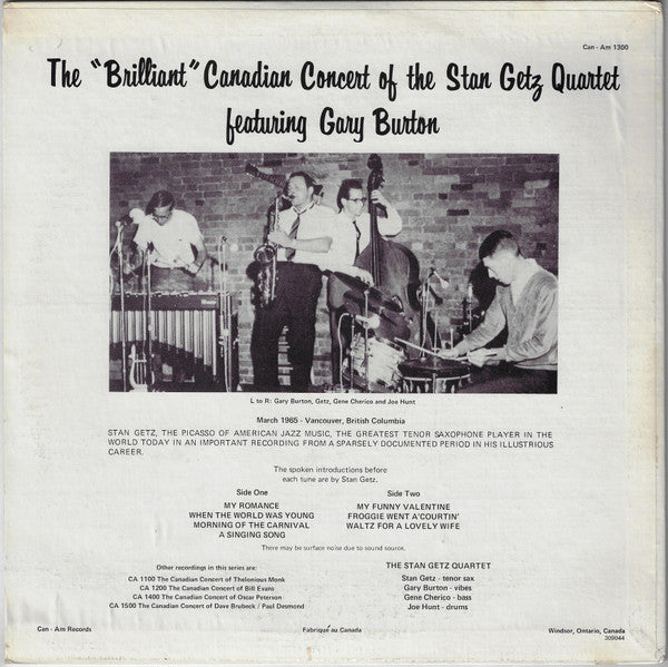 The spoken introductions before each tune are by Stan Getz. Recorded March 1965 - Vancouver, British Columbia. Cat. # on cover is Can-Am 1300 but the label shows CA 1300.