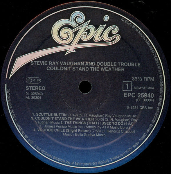 Back cover : ℗ 1984 CBS Inc. © 1984 CBS Inc. Made in Holland. Distribution CBS Records / CBS Disques S.A. In the UK apply for public performance licences to PPL. Labels : Published by Ray Vaughan Music except : A3 by Venice Music Inc. (Admin. by ATV Music Corp.) A4 by Chappell Music / Bella Godiva Music B1 by Hard Case Music B2 Pending (No Publisher name available at time of going to print) ℗ 1984 CBS Inc. Made in Holland Runouts: Everything is stamped except AL39304-1AB / BL39304-1AA + isolated P which are etched