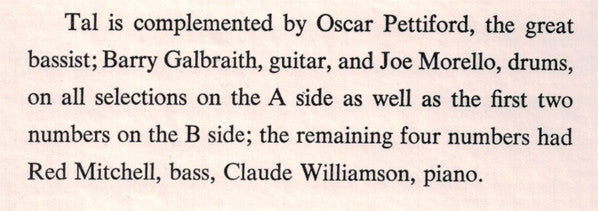 Recorded: Tracks A1 to A6, B1, B2 in early 1954 Tracks B3 to B6, July 1955 Published by: A1, A5:, A6, B6 Harms, Inc. ASCAP A2:Paramount ASCAP A3: Famous ASCAP A4: Jatap BMI B1: Orpheus B2: Chappell ASCAP B3: Bourne ASCAP B4: Robbins ASCAP B5: Bregman, Vocco & Conn ASCAP