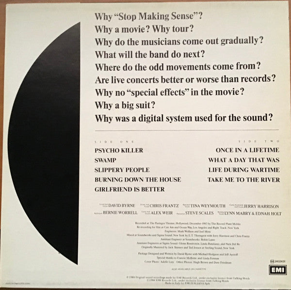"Music from a film by Jonathan Demme and Talking Heads". Made in Italy by EMI ITALIANA S.p.A.