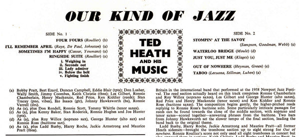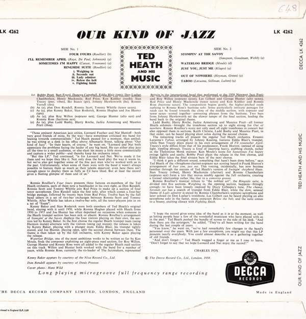 © 1958 but sleeves were printed March 1959 Made in England. Kenny Baker appears courtesy of Nixa Record Co., Ltd. Don Rendell appears courtesy of Denis Preston. Advertised as a new April release in "This Month's Decca Popular LPs in Stereo and Mono", Gramophone magazine, April 1959, p. 57.