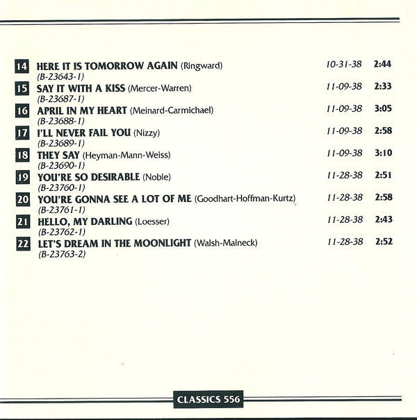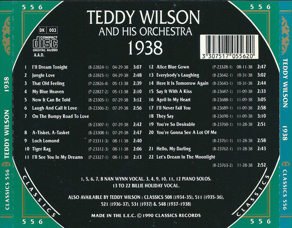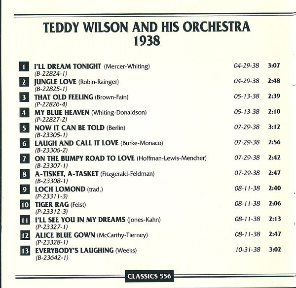 All tracks recorded in New York, 1938. Piano solos (tracks 3, 4, 9 to 12) from "Teddy School for Pianists", all other tracks intially issued on Brunswick label. Recording dates, label cat. Nr and matrix Nr initial issues : Track 1: April 29, Brunswick 8141, B-22824-1 Track 2: April 29, Brunswick 8150, B-22825-2 Track 3: May 13, Teddy School for Pianists, P-22826-4 Track 4: May 13, Teddy School for Pianists, P-22827-2 Track 5: July 29, Brunswick 8199, B-23305-1 Track 6: July 29, Brunswick 8207, B-23306-2 Track 7: July 29, Brunswick 8207, B-23307-1 Track 8: July 29, Brunswick 8199, B-23308-1 Track 9: August 11, Teddy School for Pianists, P-23311-3 Track 10: August 11, Teddy School for Pianists, P-23312-3 Track 11: August 11, Teddy School for Pianists, P-23327-1 Track 12: August 11, Teddy School for Pianists, P-23328-1 Track 13: October 31, Brunswick 8259, B-23642-1 Track 14: October 31, Brunswick 8259, B-23643-1 Track 15: November 9, Brunswick 8270, B-23687-1 Track 16: November 9, Brunswick 8265, B-23688-1 Track 17: November 9, Brunswick 8265, B-23689-1 Track 18: November 9, Brunswick 8270, B-23690-1 Track 19: November 28, Brunswick 8283, B-23760-1 Track 20: November 28, Brunswick 8281, B-23761-1 Track 21: November 28, Brunswick 8281, B-23762-1 Track 22: November 28, Brunswick 8283, B-23763-1 On tracks 1 & 2, Johnny Hodges not sure, could be Buster Bailey or Jerry Blake, according to booklet. Track 13 "Everybody's Laughing" is credited on release to a mysterious "Weeks" but it's indeed Ben Oakland and Sammy Lerner who wrote it as stated on [r4991180 and [r1685131 Track 17 "I'll Never Fail You" is credited to Nizzy, it's indeed Vic Mizzy according to [r9191606 On rear cover: Made in the E.E.C. © 1990 Classics Records. On disc: Made in France. Misspelt 'The Chronogical Classics' on the front.
