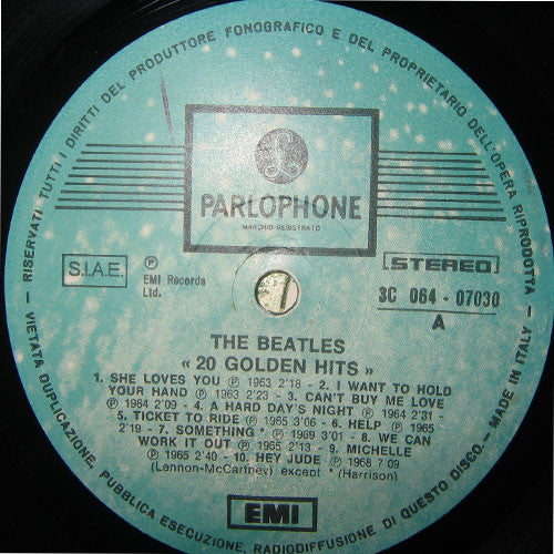Originally issued as 20 Golden Hits in 1980. In this version as you can see from the image "Radiodiffusione Di Questo Disco" of Side B does not present the dot (.)