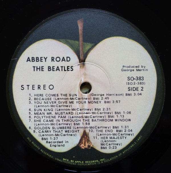Apple logo label. An E.M.I. Recording. Recorded in England. Cover type 3 : the front cover image was enlarged. The picture on the front shows less of the trees and crosswalk. This type has "Her Majesty" missing on the back cover BUT included on the label. On label : Mfd. by Apple Records AND "All rights reserved..." statement on the rim. 1975 release. Thanks to George Martin, Geoff Emerick and Phillip McDonald. Originally released October 1, 1969.