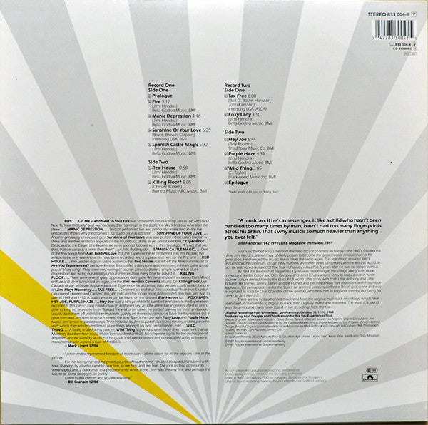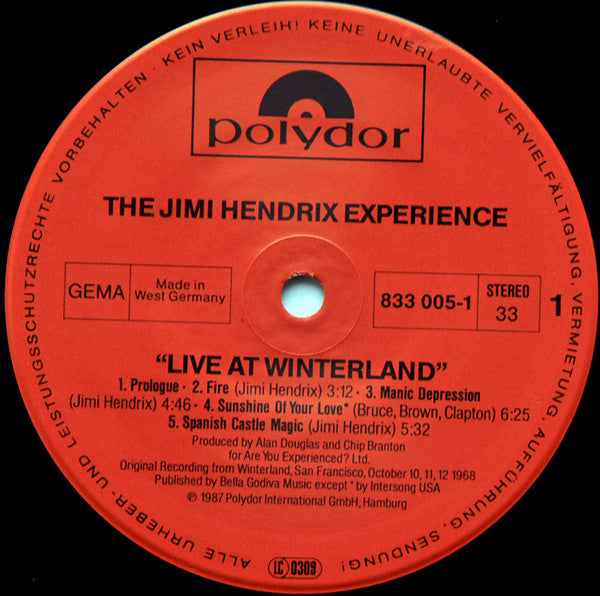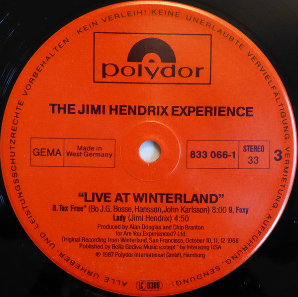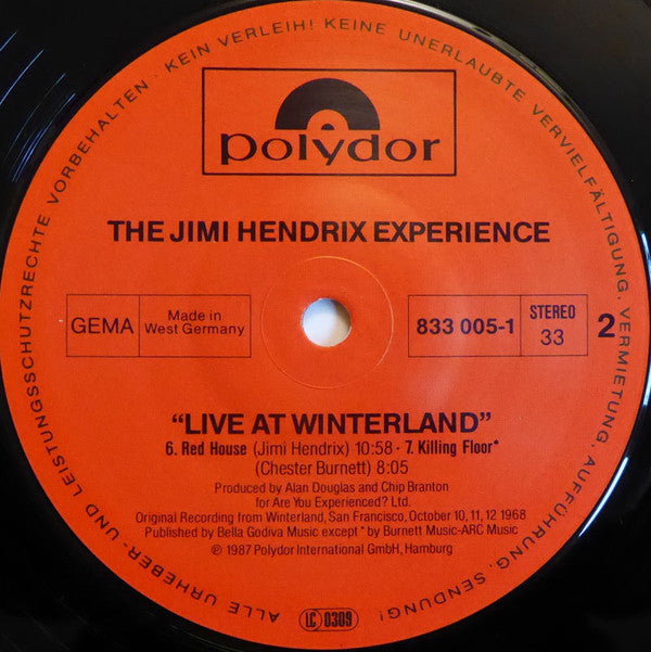 On back cover: ℗ 1987 Polydor International GmbH, Hamburg © 1987 Polydor International GmbH, Hamburg Made in West Germany by PDO for Polygram Distributed by Polygram Original sound recording made by Polydor International GmbH, Hamburg On labels: Made in West Germany Original recording from Winterland, San Francisco, October 10, 11, 12 1968 Published by: A2, A3, A5, B1, C2, D2, Bella Godiva Music, BMI A4, C1, Intersong USA, BMI B2, Burnett Music-ARC MUsic, BMI D1, Third Story Music Co., BMI D3, Blackwood Music Inc., BMI Cat.# 833 004-1 on sleeve and poster. Cat.# LP1: 833 005-1 Cat.# LP2: 833 066-1 First copies came with a fold-out replica of the poster for the concert. There is a similar version [r4570068 with Made in Holland printed on the labels. Tracklist details: "Prologue" – 0:57 "Fire" (October 11, 1968, 2nd show) – 3:12 "Manic Depression" (October 12, 1968, 2nd show) – 4:46 "Sunshine of Your Love" (Eric Clapton, Jack Bruce, Pete Brown) (October 10, 1968, 2nd show) – 6:25 "Spanish Castle Magic" (October 12, 1968, 2nd show) – 5:32 "Red House" (October 11, 1968, 1st show) – 11:32 "Killing Floor" (Chester Arthur Burnett) (October 10, 1968, 2nd show) – 8:05 "Tax Free" (Bo Hansson, Janne Carlsson) (October 11, 1968, 2nd show) – 8:00 "Foxy Lady" (October 11, 1968, 2nd show) – 4:50 "Hey Joe" (Billy Roberts) (October 12, 1968, 1st show) – 6:44 "Purple Haze" (October 12, 1968, 1st show) – 4:34 "Wild Thing" (Chip Taylor) (October 12, 1968, 1st show) – 3:05 "Epilogue" – 0:30