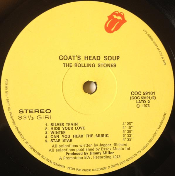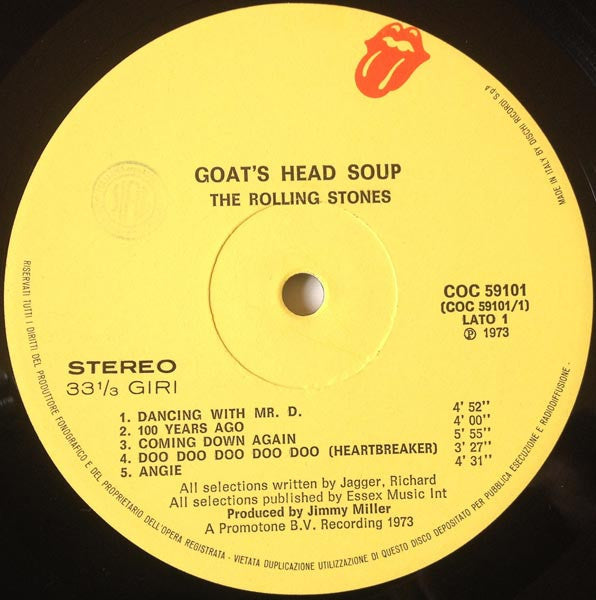 Thanks to all at DYNAMIC SOUND STUDIOS, KINGSTONE, JAMAICA, W.I. where this album was recorded. Billy Preston & Jimy Horn by courtesy of A & M RECORDS Nicky Hopkins by courtesy of C.B.S. RECORDS Since 1969, THE ROLLING STONES only on ROLLING STONES RECORDS—This is a new record, beware of repackaging ROLLING STONES RECORDS Catalogue Number : COC 59101 DISTRIBUZIONE DISCHI RICORDI S.P.A. ℗©1973 This stereo record can be played on mono reproducers provided either a compatible or stereo cartridge wired for mono is fitted. Recent equipment may already be fitted with a suitable cartridge. If in doubt consult your dealer. Matte gatefold sleeve. Generic inner sleeve without two corners. Contains a 12"x12" insert card with credits and pictures of all guest musicians. Some copies contain a 12"x12" insert card (mini-poster) of the "Goat's Head Soup" too.
