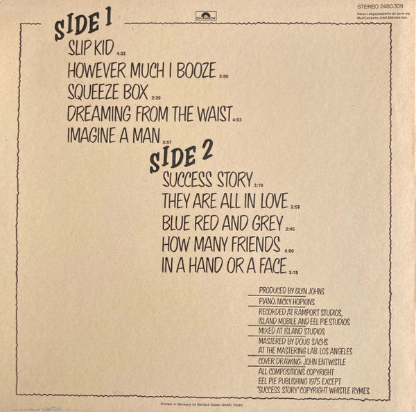 Recorded at Ramport Studios, Island Mobile & Eel Pie Studios. Mixed at Island Studios. "Limited Edition 2675 216" sticker on front cover, referring to the box set (1521292), inside which this reissue was also included. Label has a framed all black Polydor logo on the red label with the LC on the bottom. "Made in West Germany" on labels. Actual durations are listed in the tracklist, except for tracks B1, B3 and B5 where the printed durations are listed. Printed durations of the other tracks are: A1: 4:32 A2: 5:00 A3: 2:39 A4: 4:03 A5: 3:57 B2: 2:58 B4: 4:00