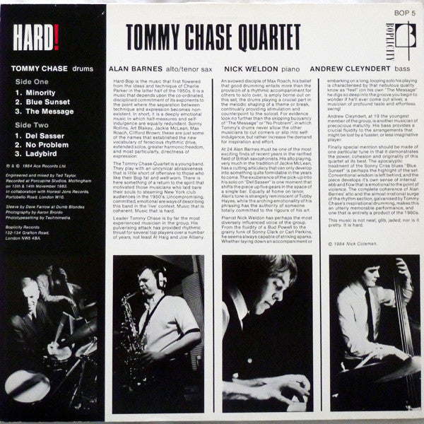 (from sleeve) ℗ & © 1984 Ace Records Ltd. Recorded at Porcupine Studios, Mottingham on 13th & 14th November 1983. In collaboration with Honest Jons Records, Portobello Road, London W10. Sleeve by Dave Farrow at Dumb Blondes (from labels) BOP 5-A/BOP 5-B ℗ 1984 Ace Records Ltd 33 1/3 rpm Stereo Made in Germany