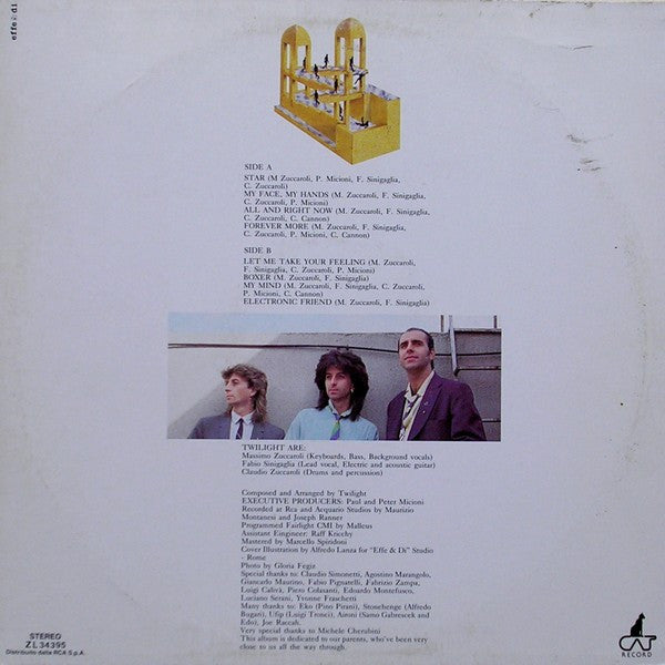 Produced for Cat Record Recorded at RCA and Acquario Studios Cover illustrated for "Effe & Di" Studio - Rome Special thanks to: Claudio Simonetti, Agostino Marangolo, Giancarlo Maurino, Fabio Pignatelli, Fabrizio Zampa, Luigi Calivà, Piero Colasanti, Edoardo Montefusco, Luciano Serani, Yvonne Fraschetti. Many thanks to: Eko (Pino Pirani), Stonehenge (Alfredo Bugari), Ufip (Luigi Tronci), Aironi (Samo Gabrescek and Edo), Joe Raccah. Very special thanks to Michele Cherubini. This album is dedicated to our parents, who've benn very close to us all the way through.