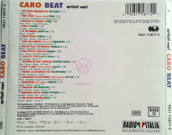 A Collection of 60's Beat Italian Classics. ℗ This compilation 1992 CGD. Manufactured in Italy by Pozzoli CD SpA.