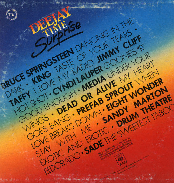 Special thanks to all the staff at Radio Dee Jay and Dee Jay Television. (P) CBS Dischi SpA Track A2 is incorrectly given as "Hot Hot" instead of "Hot Shot". Track A4 is simply given as "My Heart Goes Bang" instead of the full track title "My Heart Goes Bang (Get Me To The Doctor)". Track A6 is given as "Taste Of Your Tears" instwad of "The Taste Of Your Tears". Track B2 is given as "Goonies 'R' Good Enough", instead of "The Goonies 'R' Good Enough".