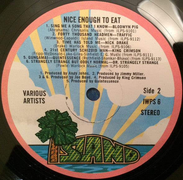 1970s palm tree label reissue. No track times are given on this record. A1. (Thompson) Warlock Music (from ILPS-9102 Unhalfbricking) A2. (Sahm) MCPS (from ILPS-9108 Mott The Hoople) A3. (Wright) Blue Mountain Music (from ILPS-9107 Spooky Two) A4. (Anderson)Chrysalis Music (from ILPS-9103 Stand UP) A5. (Fraser-Rodgers)Blue Mountain Music (from ILPS-9104 Free) A6. (Gibson) Maroon Music B1. (Abrahams)Chrysalis Music (from ILPS-9101 Ahead Rings Out) B2. (Winwood-Capaldi)Island Music (from ILPS-9112 Best Of Traffic) B3. (Drake) Warlock Music (from ILPS-9106 Five Leaves Left) B4. (Fripp-McDonald-Lake-Giles-Sinfield) E.G. Music (from ILPS-9111 In The Court Of The Crimson King) B5. (Rothfield-Shankar-Bhava) Blue Mountain Music (from ILPS-9113 Quintessence) B6. (Pawle) Warlock Music (from ILPS-9105 Kip Of The Serenes) (Not credited on release, track A6 is a stereo remix of the 'Heavy Jelly' single). Images of 8 of the album covers appear on the back cover, where sleeve artist credit appears bottom-left, together with; "(Logo) Island Records Ltd., Basing Street, London W11"