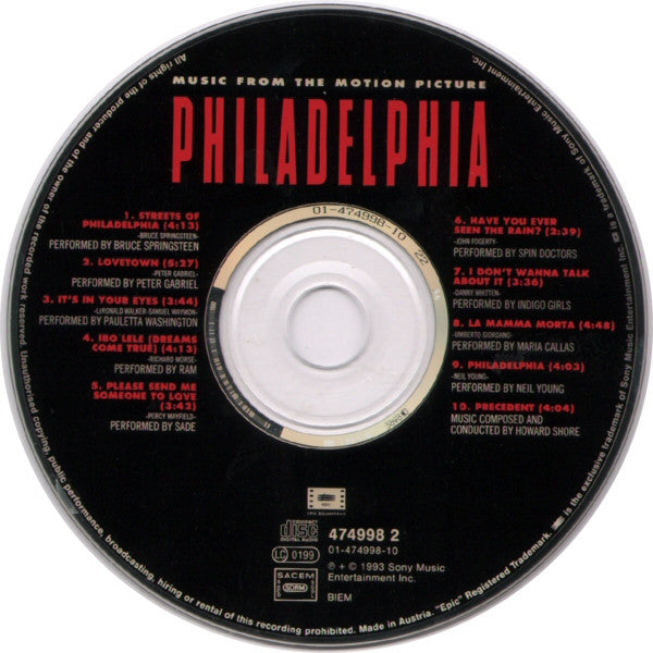 Released in a jewel case with dark grey tray and a 6-page folded front insert. Some copies came with "Filmstart 24. Februar" hype sticker. Some copies with sticker on front: "Academy Award Winner Best Original Song Bruce Springsteen "Streets Of Philadelphia" 01-474998-10" On copies sold in Spain, labels with the inscription: Óscar a la mejor canción “Streets of Philadelphia” Bruce Springsteen. Óscar al mejor actor Tom Hanks, 47-474998-10. Motion Picture Photography and Artwork Title: © 1993 Tristar Pictures, Inc. © 1993 Sony Music Entertainment Inc. / "Epic" Registered Trademark ℗ + © 1993 Sony Music Entertainment Inc. Made in Austria on CD