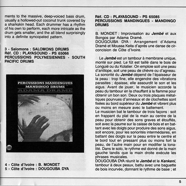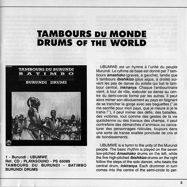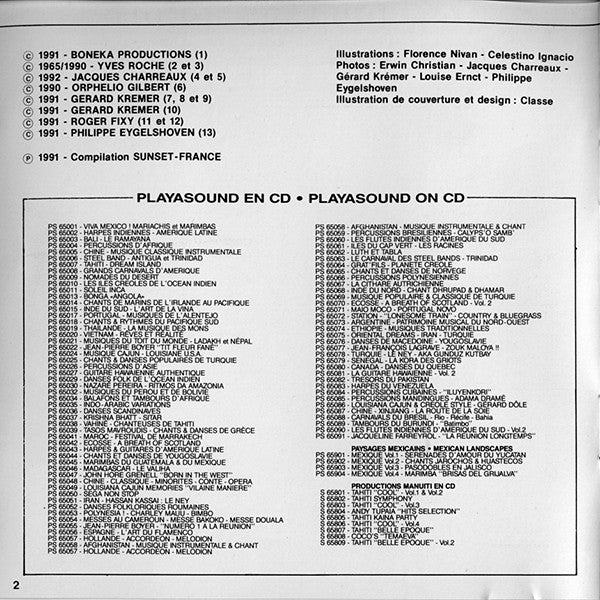 Track 1 taken from release PS 65089 : [r4556920. Tracks 2 & 3 taken from release PS 65066 : Percussions Polynésiennes - South Pacific Drums. Tracks 4 & 5 taken from release PS 65085 : [r1770509. Track 6 taken from release PS 65059 : Percussions Brésiliennes - Calyps'O Samb'. Tracks 7 & 8 taken from release PS 65026 : [r5485780. Track 10 taken from release PS 65034 : [r5134958. Tracks 11 & 12 taken from release PS 65084 : Percussions Cubaines - Cuban Drums. Track 13 taken from release PS 65004 : [r1907131. © 1991 Boneka Productions (1) © 1965/1990 [a826242 (2 et 3) © 1992 [a4014269 (4 et 5) © 1990 Orphelio Gilbert (6) © 1987 [a991710 (7, 8 et 9) © 1989 [a991710 (10) © 1990 Roger Fixy (11 et 12) © 1991 [a4688785 (13)