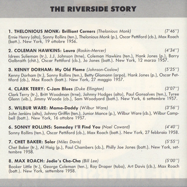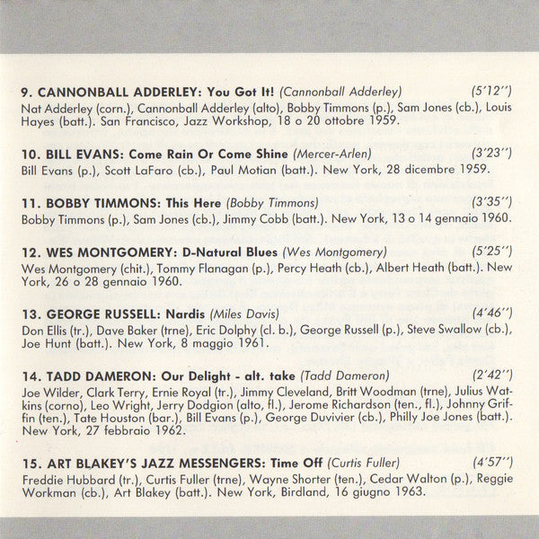 ℗ 1994 S.I.A.E. CD fuori commercio allegato a Musica Jazz n. 1/94. [Out of commerce CD attached to Musica Jazz n. 1/94. Tempo totale 70'29". Per gentile concessione OM Discs s.r.l. su licenza Fantasy Inc. [Courtesy of OM Discs s.r.l. licensed under Fantasy Inc. Sessions location and date: # 1 - New York, October 19, 1956. # 2 - New York, March 12, 1957. # 3 - New York, May 27, 1957. # 4 - New York, September 6, 1957. # 5 - New York, October 16, 1957. # 6 - New York, February 27, 1958. # 7 - New York, September 1958. # 8 - New York, September 1958. # 9 - Jazz Workshop, San Francisco, October 18 or 20, 1959. # 10 - New York, December 28, 1959. # 11 - New York, January 13 or 14, 1960. # 12 - New York, January 26 or 28, 1960. # 13 - New York, May 8, 1961. # 14 - New York, February 27, 1962. # 15 - Birdland, New York, June 16, 1963.