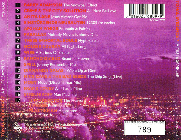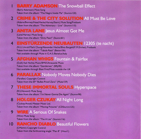 This compilation was sold at Tower Records in the UK as part of a Mute Records promotion. Initial copies were numbered and sold out quickly, so additional copies were pressed /release/1900016without a number on the back. This entry is for the copies with numbers stamped on the back cover. Track 17 is a mix of all three of those tracks.
