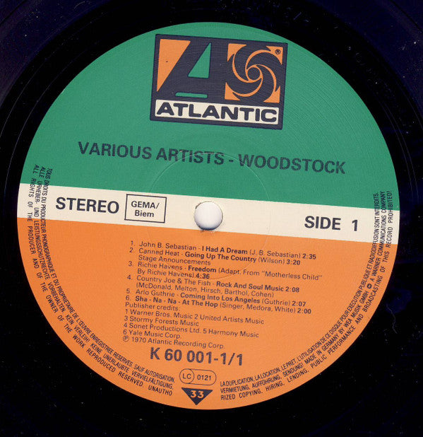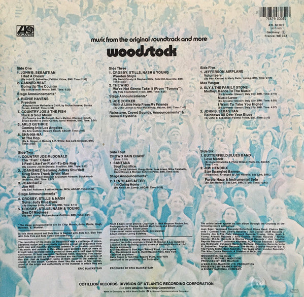 The stage announcements are by Chip Monck, John Morris, Hugh Romney & Muskrat. Cotillion Records, Division of Atlantic Recording Corporation (P)+(C)1970 Atlantic Recording Corporation Made in Germany by WEA Musik GmbH - A Warner Communications Company Center labels have cat# K 60 001 There are other, almost similar releases with same catalog# here: - All with same cat# ATL 60001 / (SD 3-500) on sleeve back - All have the same misprint on labels (C1 - "Wooden Chips" instead of "Wooden Ships", "Stage announcements" missing before C3, E2 - 2nd part of medley "Music Lover" missing) - 1-7 have "ATL 60001" on labels and the 2nd cat# ST-CTN-701 881 (..882 / ..883 etc.) - 1-6 are GEMA, later releases where distributed in whole EU and have GEMA/BIEM. - 1-5 have 2 lines of circled text on label rim, later relases have 3. - 1-4 are autocoupled releases (LP1: Side A / Side F; LP2: B/E; LP3: C/D). - 1-4 have catalog# on label formatted as "ATL 60001-1"´, "..60001-2" etc - not "60001-1/1", "..1/2" like #3-#6. - 1-4 only have "Side 1"/"Side 2" on all three LPs; #1 - Release 3374126 - Oldest release (Kinney) - no "Warner Communications" on label; TWEN Series; "L" price code on back; #2 - Release 10413516 - TWEN Series - now WEA release; "E" price code on back From #3 onwards "Warner Communications" is mentioned on label rim text and all have a label code - so after ~1976: #3 - Release 3596522 - TWEN Series; "E" price code on back From #4 onwards price code on sleeve back is "E" & "WE323: #4 - Release 4455275 From #5 onwards side# are "Side 1" to "Side 6", no longer autocoupled: #5 - Release 3931645 From #6 onwards 3 lines of label rim text: #6 - Release 6863434 From #7 onwards GEMA/BIEM #7 - Release 9694895 #8 - Release 557355 - "K 60001" on labels #9 - Release 2831793 - "K 60001" on labels - youngest release with barcode [CURRENTLY VIEWED VERSION
