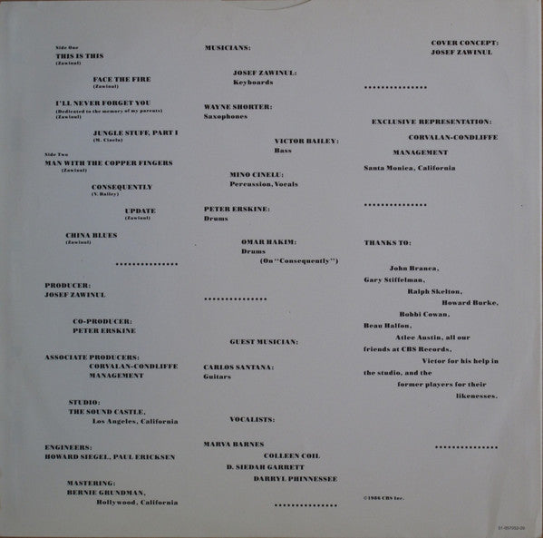 Studio: The Sound Castle, Los Angeles, California Mastering: Bernie Grundman, Hollywood, California Exclusive Representation: Corvalan-Condliffe Management Santa Monica, California Back cover: Ⓟ 1986 CBS Inc. / Ⓒ 1986 CBS Inc. / Printed in Holland / Imprimé en Hollande / Distribution CBS Records / CBS Disques S.A. Disc labels: Ⓟ 1986 CBS Inc. Made in Holland comes with original inner sleeve with credits and illustrations of the musicians