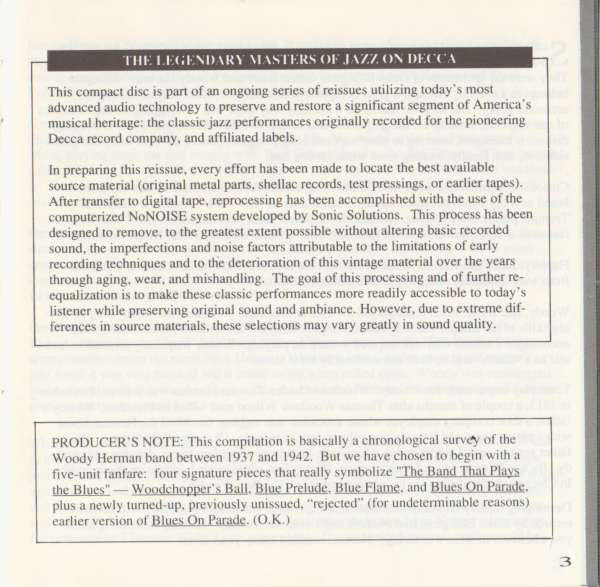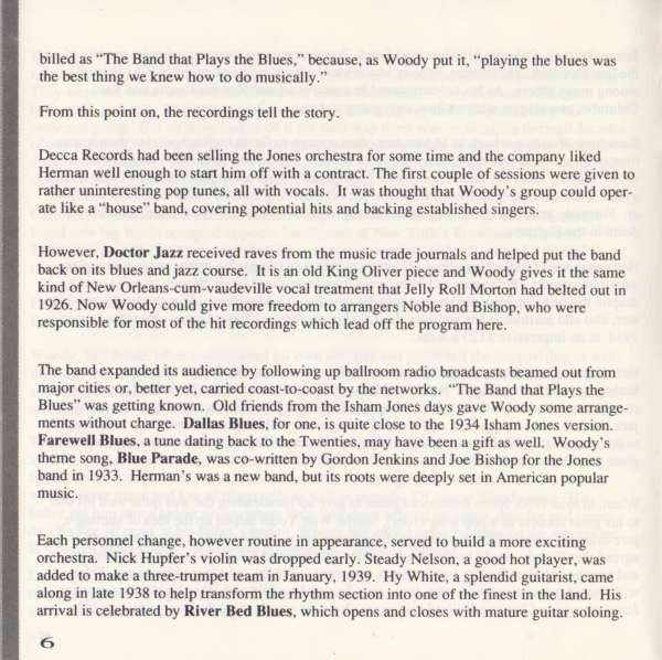 Recorded all in New York City (exceptions indicated) #6: April 26, 1937 #7: December 22, 1938 #1, #8 & #9: April 12, 1939 #10: May 24, 1939 #2: November 20, 1939 #3: December 13, 1939 #4: February 5, 1940 #11 & #12: April 18, 1940 #13: September 9, 1940 #5 & #14: February 13, 1941 #15: March 11, 1941 #16: August 21, 1941, Los Angeles #17 & #18: September 10, 1941, Los Angeles #19: November 13, 1941, Chicago #20: July 24, 1941, Los Angeles Track 4 called "Blue Prelude" on back cover, "Blue Parade" in sleeve. Track 2 and Track 10 previously unreleased.