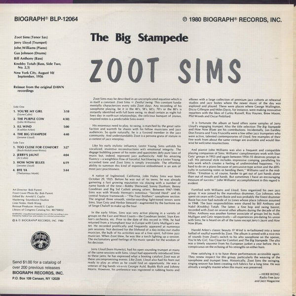 Ⓒ & Ⓟ 1980 Biograph Records, Inc. Reissued from the original Dawn Recordings in New York in 1956 Recorded New York City, August 10/ September 1956 Biograph Records, Inc. 1980 Library of Congress Catalog No 80-750032